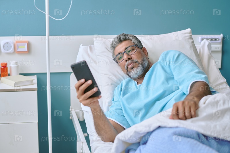 Мужчина среднего возраста, лежащий в больничной постели с помощью смартфона
