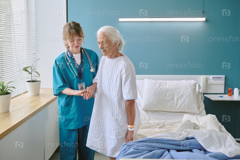 Старшая женщина, поддерживаемая молодой взрослой медсестрой-женщиной, встает на ноги