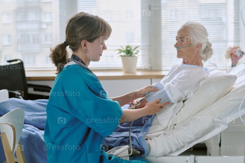 Сестра среднего возраста измеряет кровяное давление пожилой женщины