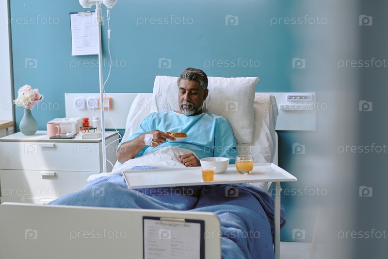 Мужчина среднего возраста, который ест завтрак в то время как отдыхает на больничной койке