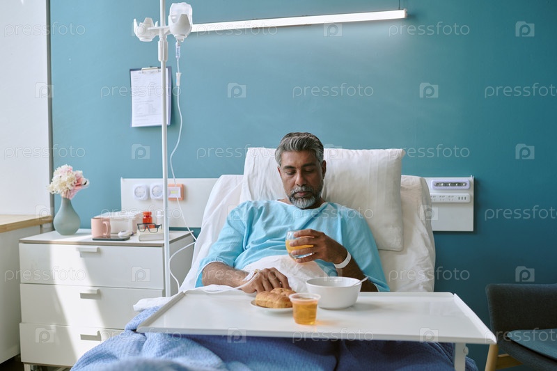 Мужчина среднего возраста с бирациальной формой отдыхает в больничной постели и пьёт апельсиновый сок