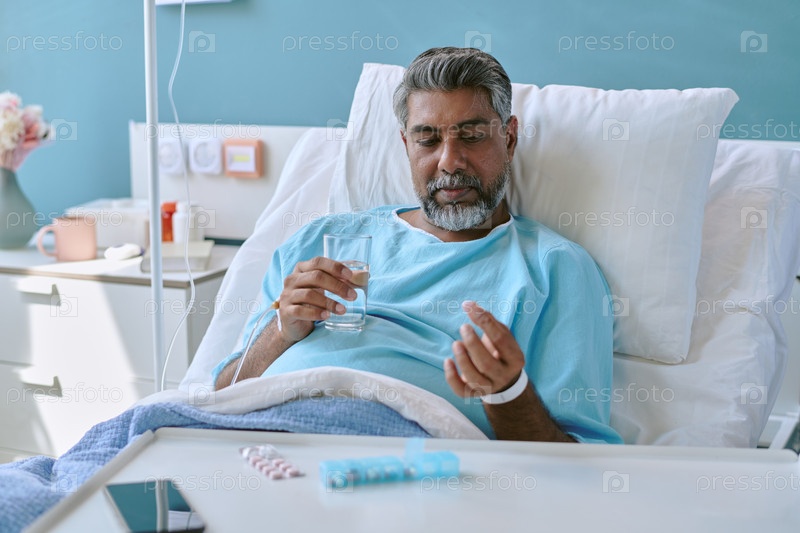 Мужчина среднего возраста с двуликой фигурой лежит в больничной кровати, принимая лекарства с водой