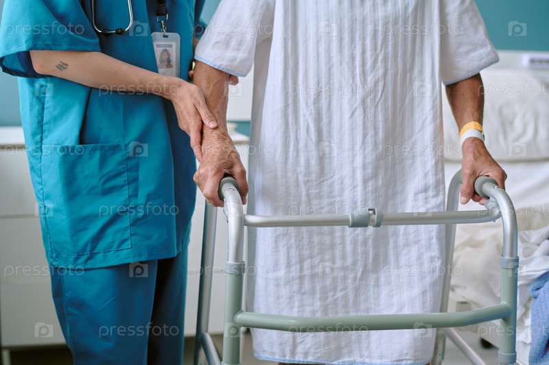 Сестра среднего возраста помогает старшему мужчине с помощью ходока
