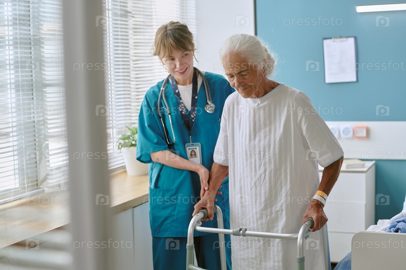 Женщина-старший, использующая ходунка с помощью молодой взрослой женщины - медицинского работника