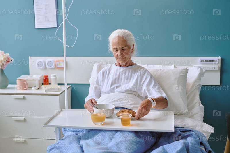 Пожилая женщина съедает завтрак в больничной постели во время выздоровления