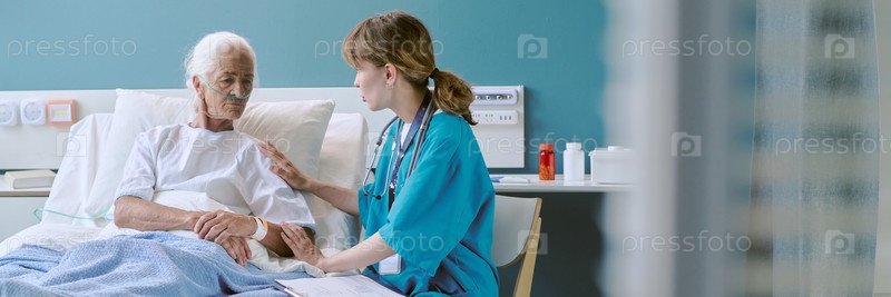 Медсестра утешает старшего пациента в больнице Молодой