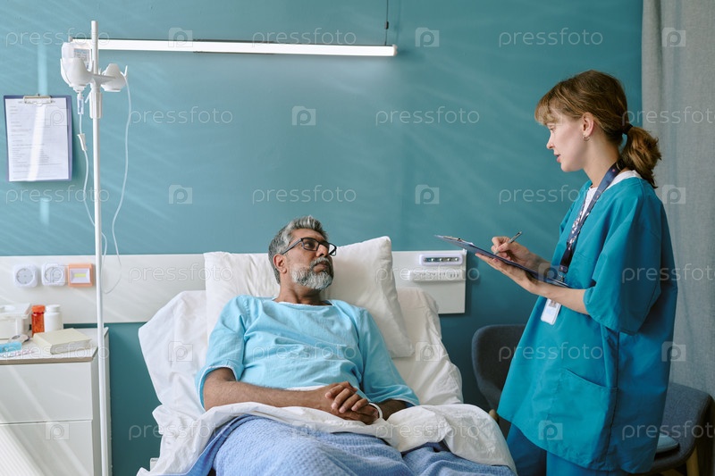 Мужчина среднего возраста с бирациальной внешностью лежит в больничной постели, разговаривает с медсестрой-молодым взрослым