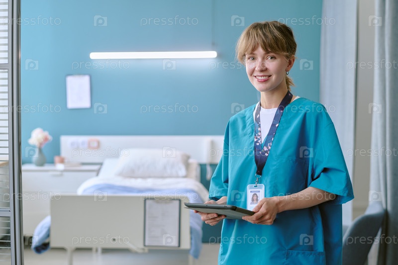 Портрет молодой взрослой женщины медсестры, улыбающейся в то время как она держит планшет