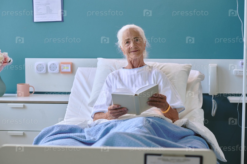 Портрет пожилой женщины, сидящей в больничной постели и читающей книгу