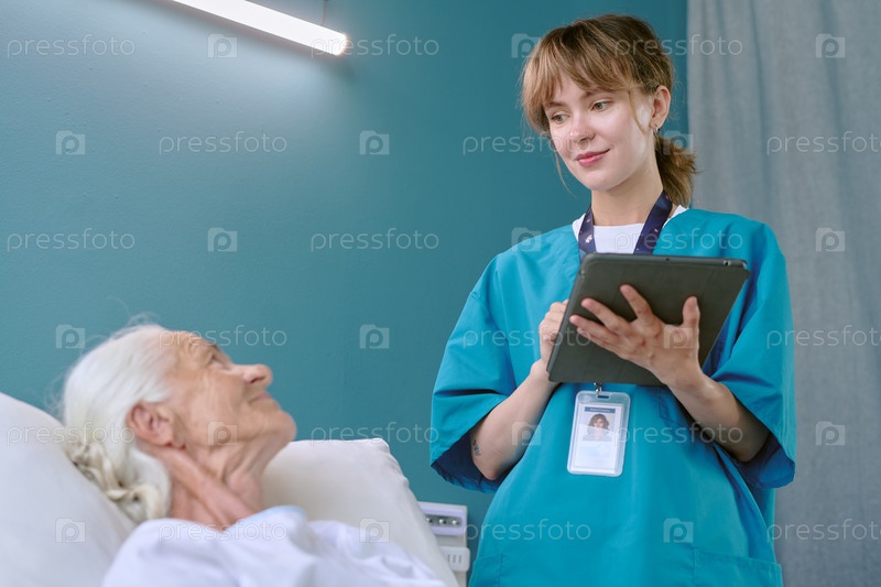 Молодая женщина медсестра консультирование старшая женщина пациент в больнице