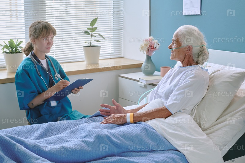 Старшая женщина разговаривает с молодой взрослой женщиной-врачом в больничной комнате