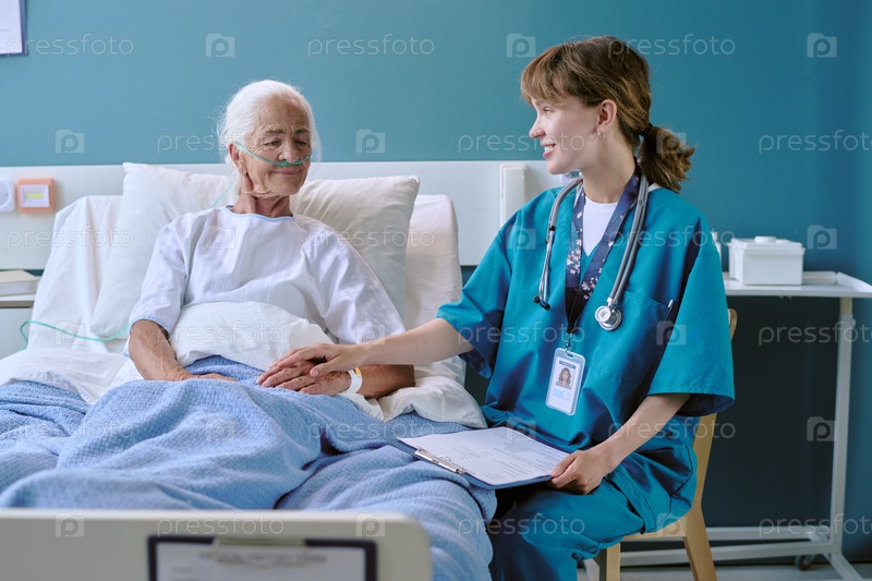 Женщина лежит в больничной постели, получая уход от молодой старшей медсестры