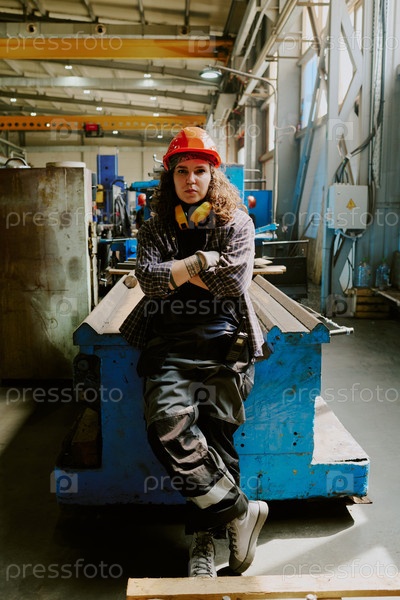 Портрет молодой взрослой женщины в жесткой шляпе, сидящей на фабрике