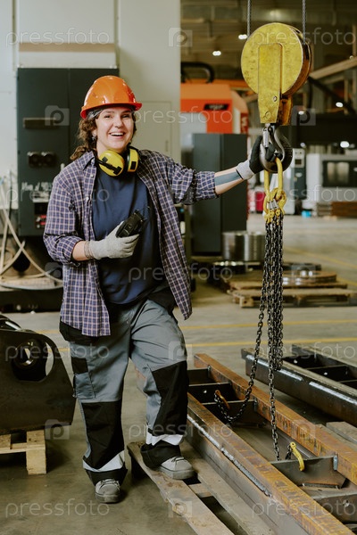 Молодая взрослая женщина, эксплуатирующая промышленный кран на фабрике