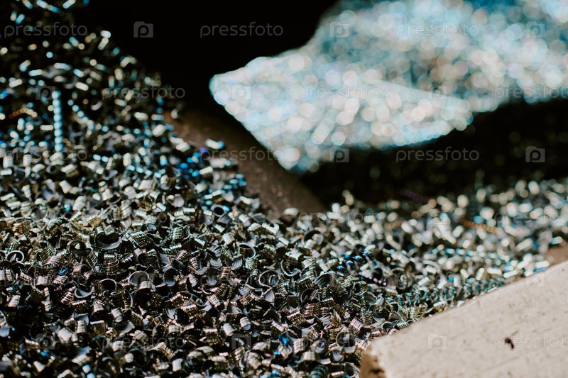Клюшовый снимок, показывающий металлические чешуи, разбросанные по поверхности промышленной мастерской