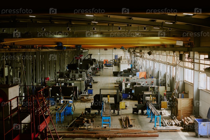 Промышленный фабричный интерьер с автоматизированными машинами, работающими в мастерской