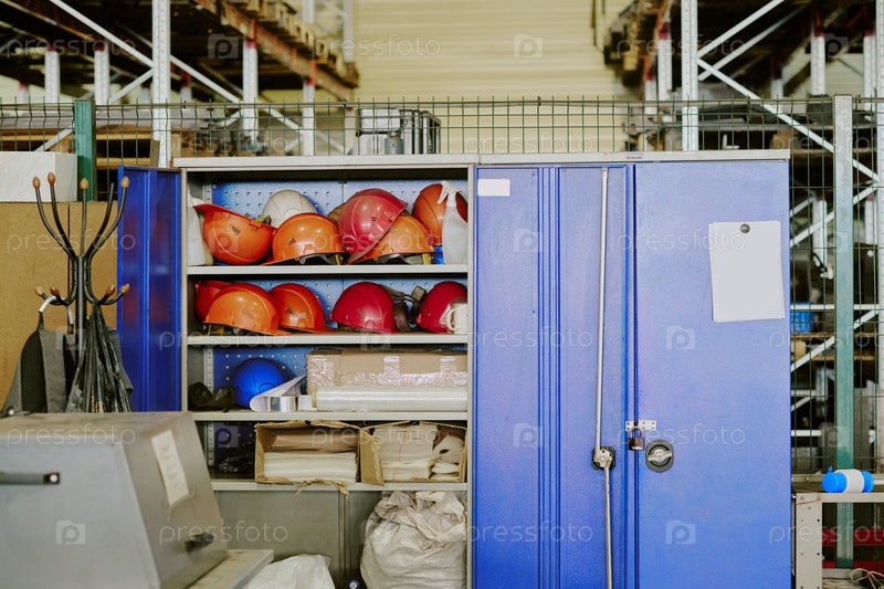 Хранилищный шкаф, содержащий шлемы промышленной безопасности в складской среде