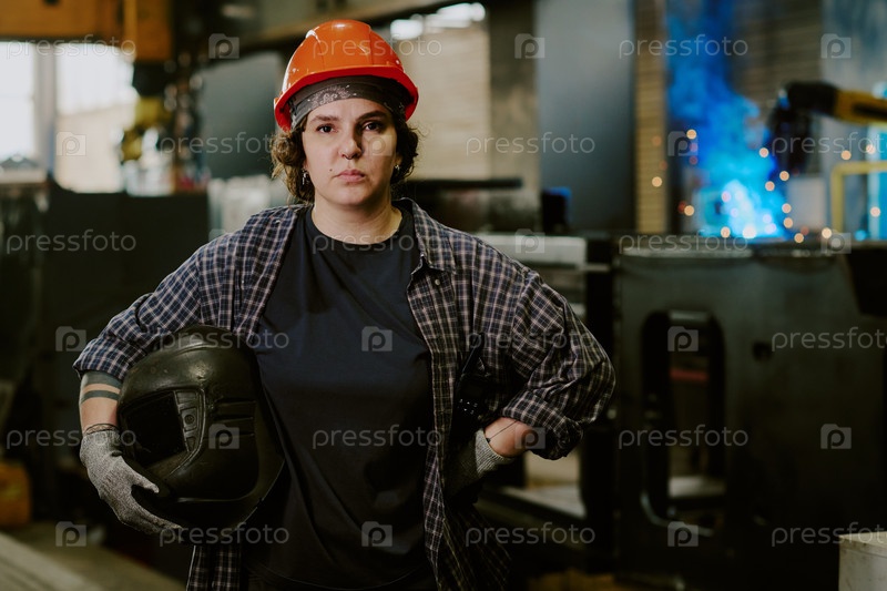 Портрет молодой взрослой женщины в жесткой шляпе, стоящей на мастерской