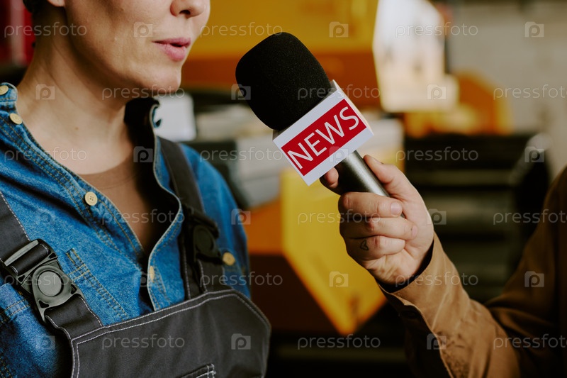 Молодая взрослая женщина дает интервью во время освещения новостей в СМИ