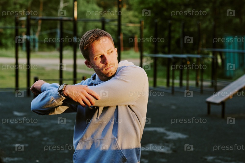 Молодой взрослый мужчина растягивает руки на открытом воздухе во время тренировки