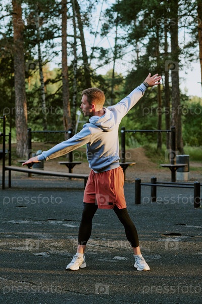 Молодой человек растягивает руки на открытом воздухе во время утренней тренировки