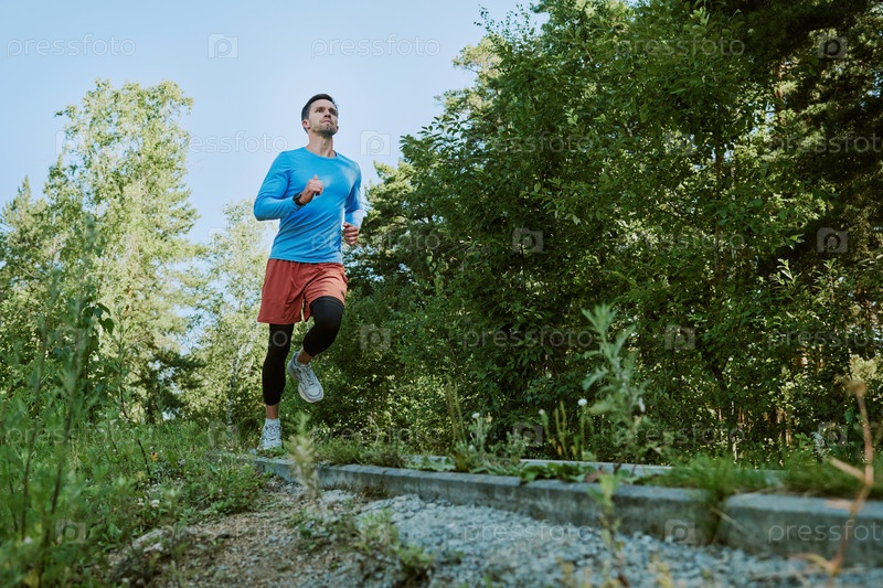Молодой взрослый мужчина бегает на открытом воздухе вдоль лесной тропы утром