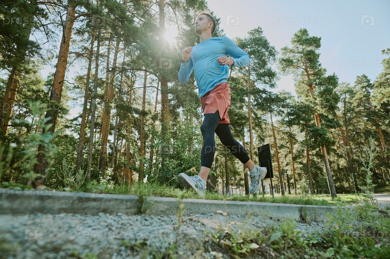 Молодой взрослый мужчина бегает на улице в лесу солнечным утром