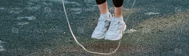 Header of Молодая взрослая женщина прыгает по веревке на открытом воздухе