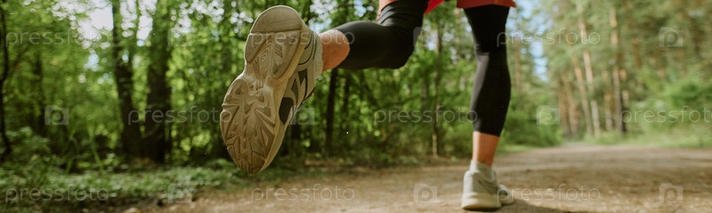 Заголовок с молодой взрослой женщиной, бегущей на открытом воздухе по лесной тропе