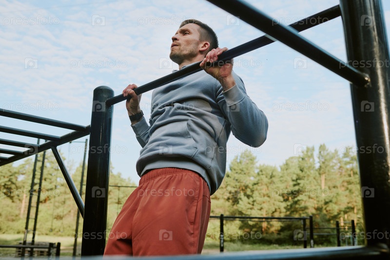 Молодой взрослый мужчина занимается спортом на свежем воздухе, выполняет подтяжки в баре