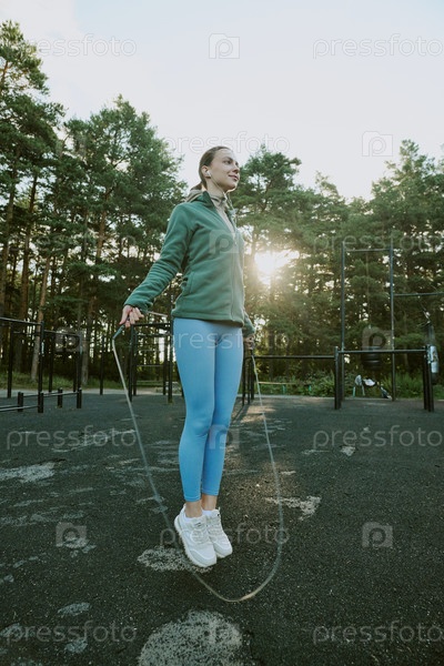 Молодая взрослая женщина, занимающаяся на открытом воздухе с помощью скакалки при восходе солнца