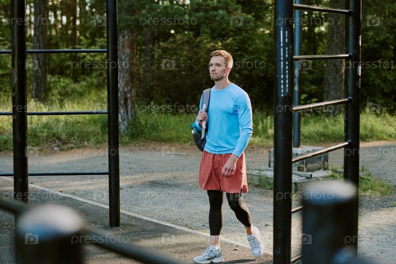 Молодой взрослый мужчина ходит на улице, неся спортивную сумку после тренировки