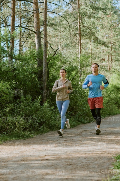 Молодая женщина и молодой человек бегают на открытом воздухе в лесу
