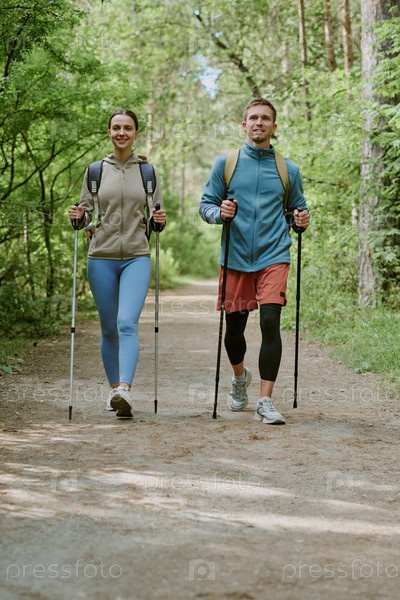 Молодой мужчина и женщина путешествуют с поляками вдоль лесного пути