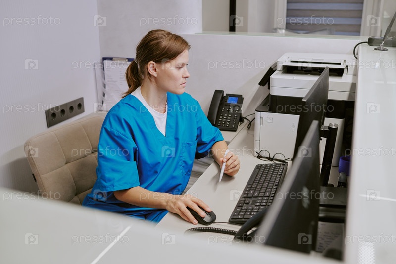 Молодая взрослая женщина работает на компьютере в приемной медицинского кабинета