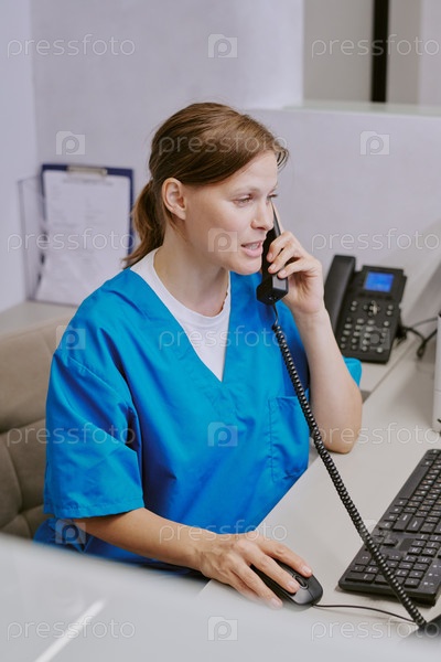 Молодая взрослая женщина работает в приемной, отвечает на телефонный звонок