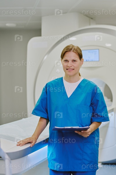 Молодая взрослая женщина стоит возле МРТ-сканера, держащая клипборд