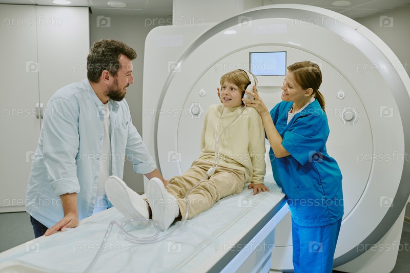 Мальчик слушает музыку во время МРТ-сканирования с врачом и родителем поблизости