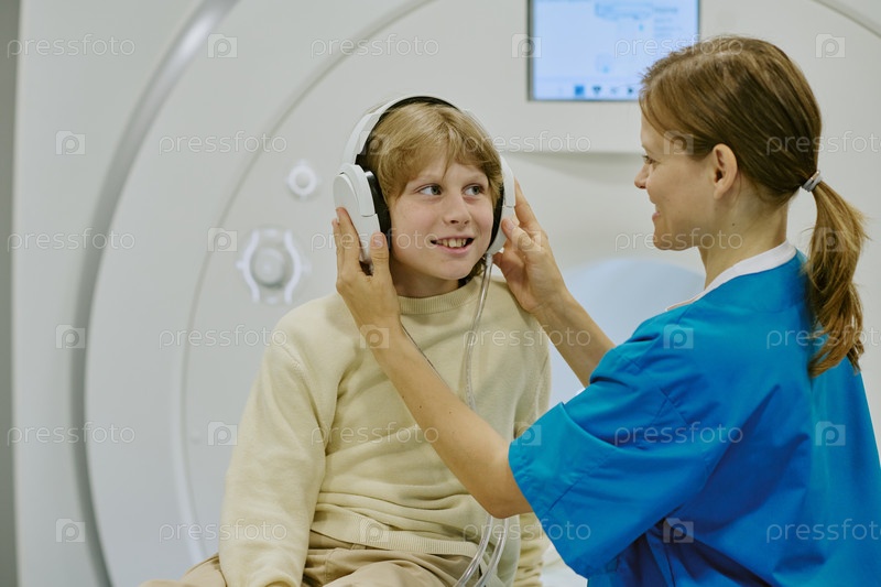 Мальчик улыбается, пока медицинский работник настраивает наушники перед МРТ-сканированием
