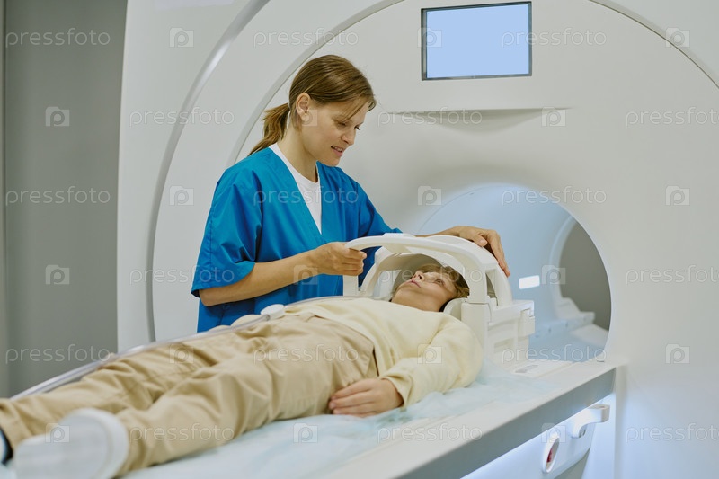 Медицинский работник, готовящий ребенка-пациента к процедуре МРТ