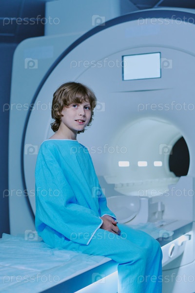 Ребенок, сидящий за столом МРТ-сканера и ожидающий медицинского обследования