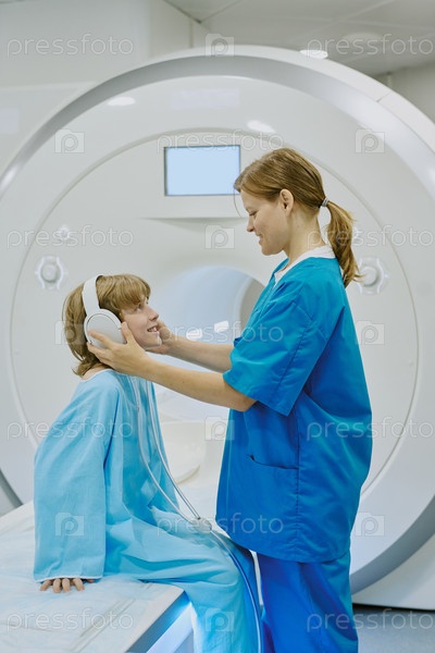 Женщина-медицинский работник, оказывающая помощь детскому пациенту перед МРТ сканированием