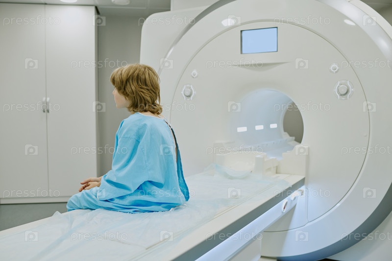 Девушка-подросток ждет МРТ в больничной диагностической палате