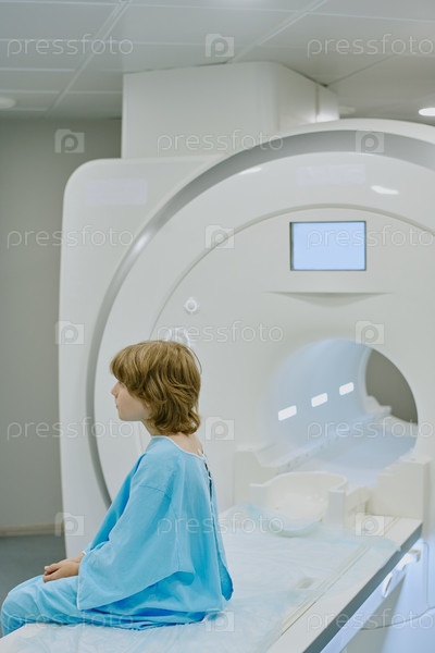 Ребенок, сидящий на МРТ-сканере, готовящийся к медицинскому осмотру