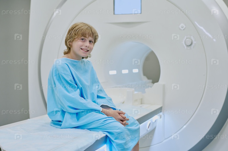 Ребенок сидит на больничной койке улыбается перед тем, как пройти МРТ-сканирование