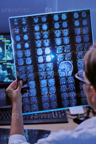 Женщина среднего возраста изучает МРТ-сканирование мозга в медицинском кабинете