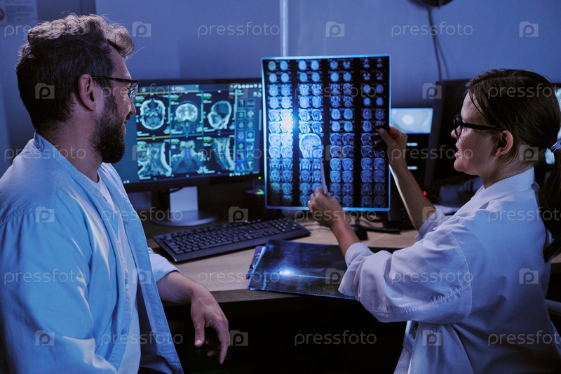 Мужчина и женщина среднего возраста анализируют сканирование мозга в медицинском кабинете