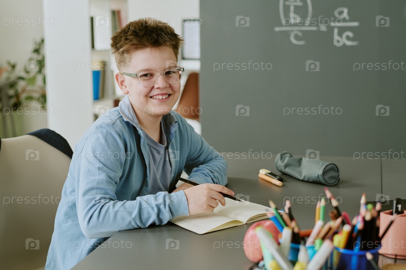 Портрет улыбающегося мальчика, пишущего в блокноте на классном столе