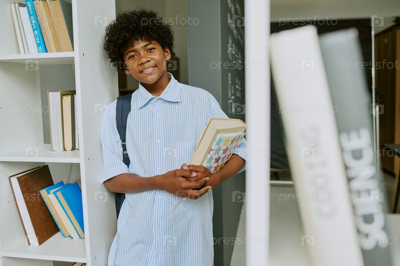 Портрет чернокожего мальчика-подростка, улыбающегося в то время как он держит книги на школьном коридоре