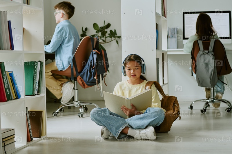 Азиатская девочка читает книгу, сидя на полу в современной школьной библиотеке
